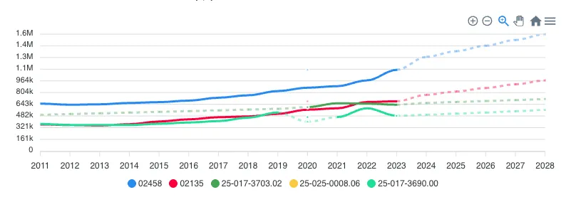 I've made it a habit to check where the solid-to-dashed transition falls relative to my decision-making data. If the trend only looks good in projected territory, I discount it. Projections based on strong historical patterns deserve more weight than projections based on a couple data points during an unusual period (like a pandemic-driven migration surge). The visual distinction makes this check instant rather than something I have to mentally track.