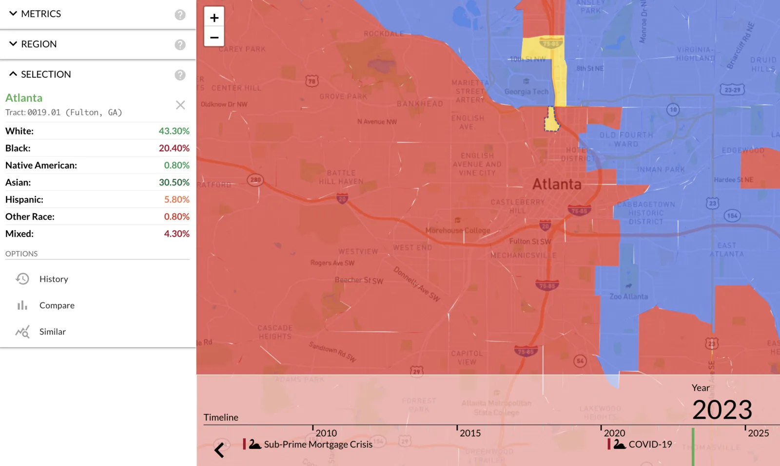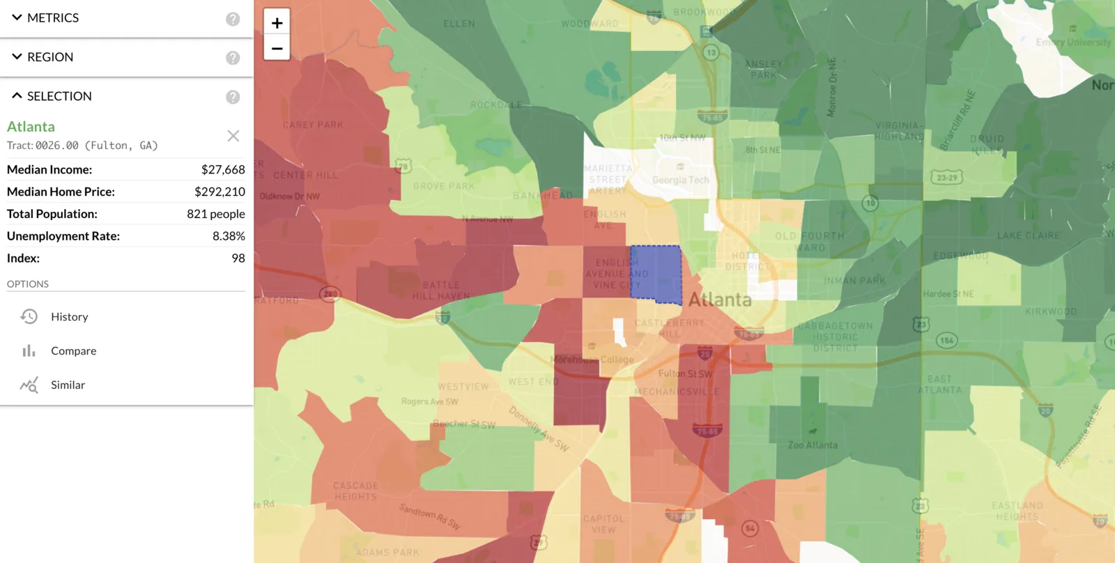 2023 Income, home prices, unemployment, and population by Census tract in downtown Atlanta, source: Investomation