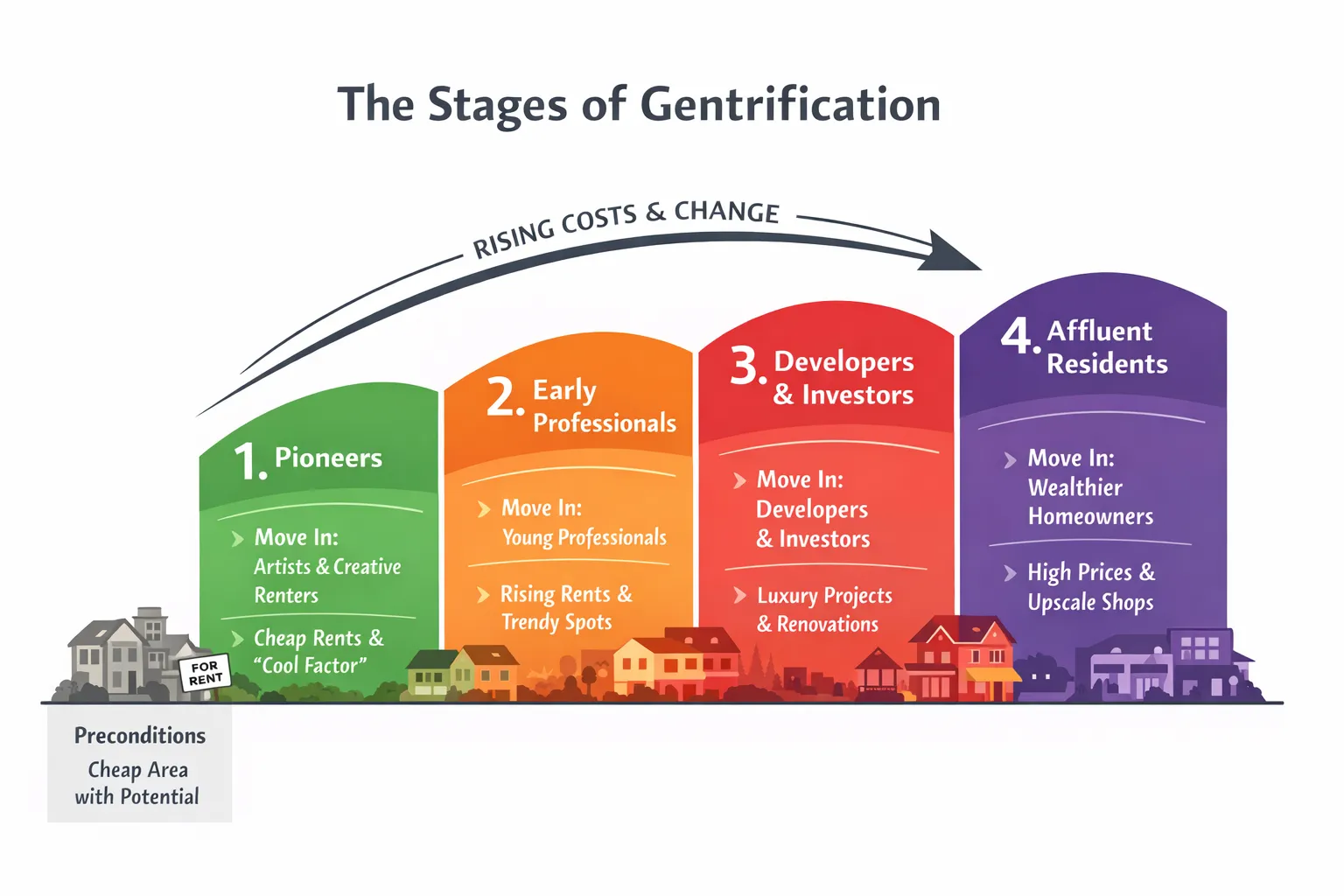 Gentrification is fundamentally driven by demand. As cities grow and prosper, more people want to live in convenient, amenity-rich neighborhoods. When the cost of living soars in a city’s most desirable areas, residents and newcomers naturally look to adjacent, previously lower-cost neighborhoods for housing. In other words, gentrification occurs when affluent or middle-class households “filter” into historically working-class or low-income areas, increasing competition for housing there. Economist Jacob Vigdor famously defined gentrification as "an increase in demand to live in a formerly high-poverty neighborhood." (Vigdor, 2023) It’s a market signal that a location - due to proximity, character, or amenities - has been “rediscovered” as valuable.