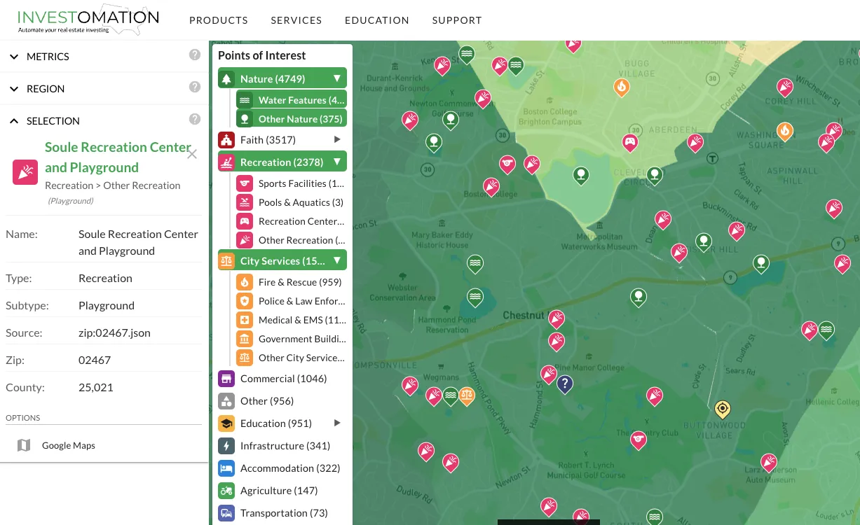 Before I added Points of Interest to Investomation, checking what's near a property meant toggling between Google Maps, school district websites, transit authority maps, and crime databases. Every source had a different interface, different granularity, and different update schedule. I'd spend twenty minutes just figuring out whether a property was near a university, how far it was from the nearest highway on-ramp, and whether there was a fire station within reasonable response distance. Multiply that by ten properties and the research phase of any deal was eating hours that should have gone into analysis.