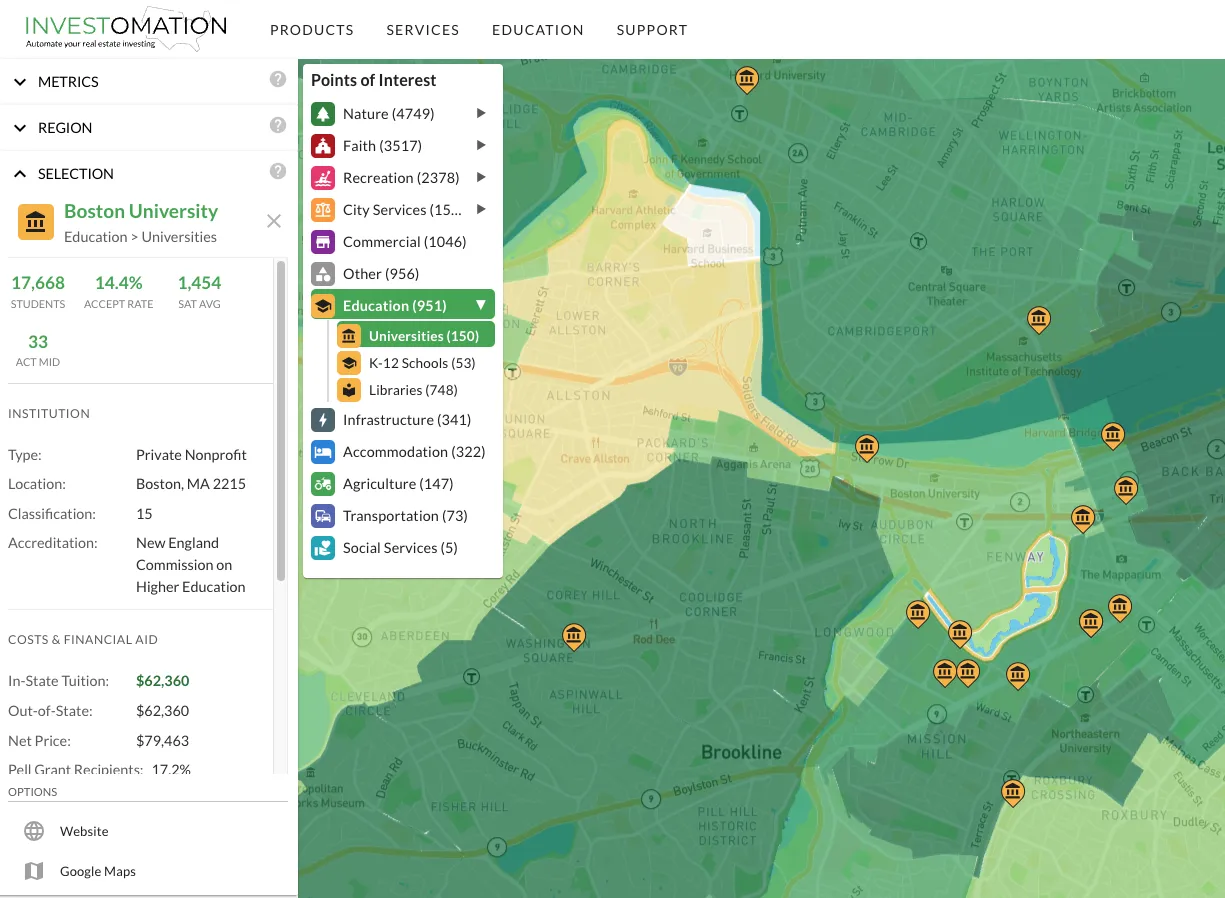 Most mapping tools will show you that a university exists nearby. Investomation goes deeper. For each university, you get student body size, acceptance rates, SAT/ACT score ranges, tuition figures, and post-graduation earnings data. This turns a generic "there's a college here" into an actual investment thesis.