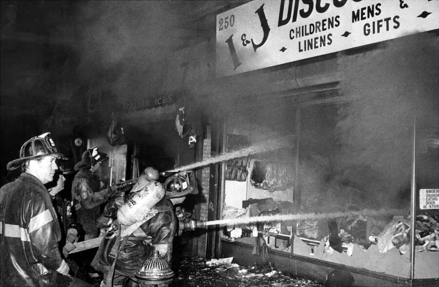 Firefighters battle a burning building in the South Bronx during the late 1970s.